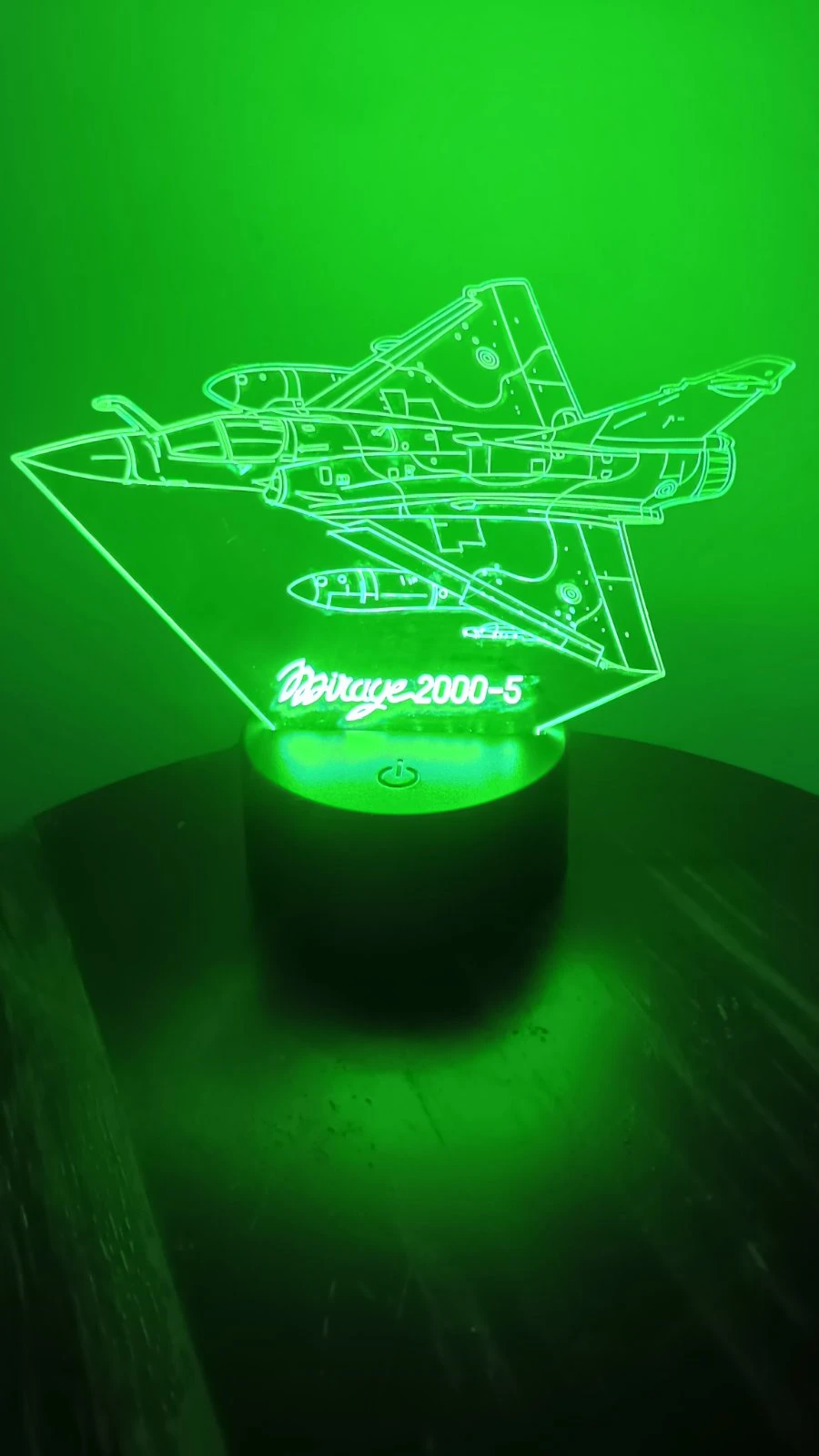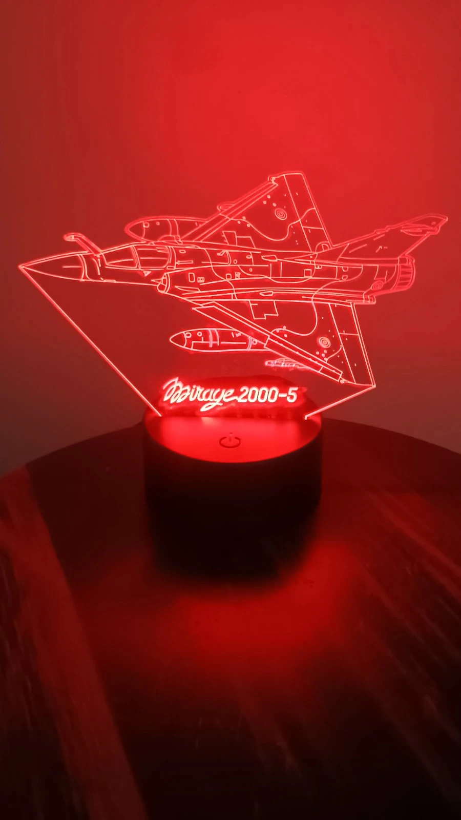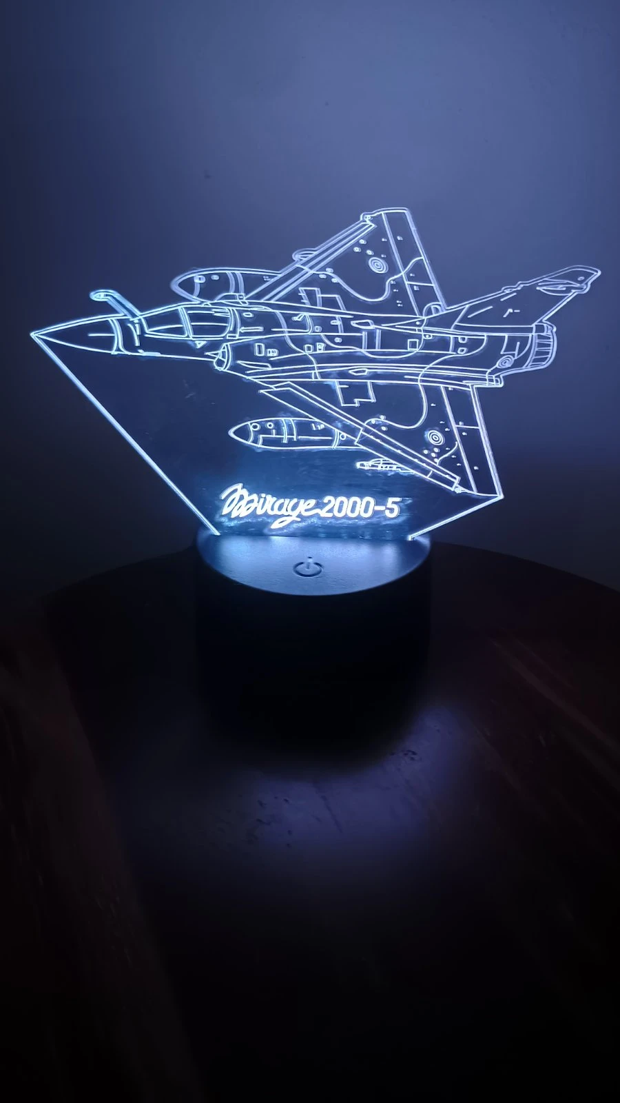 Abold tribute to modern airpower. Featuring a precision-engraved silhouette of the MIRAGE 2000-5 on crystal-clear acrylic, this stunning desk light rests on a vivid 7-color LED base.