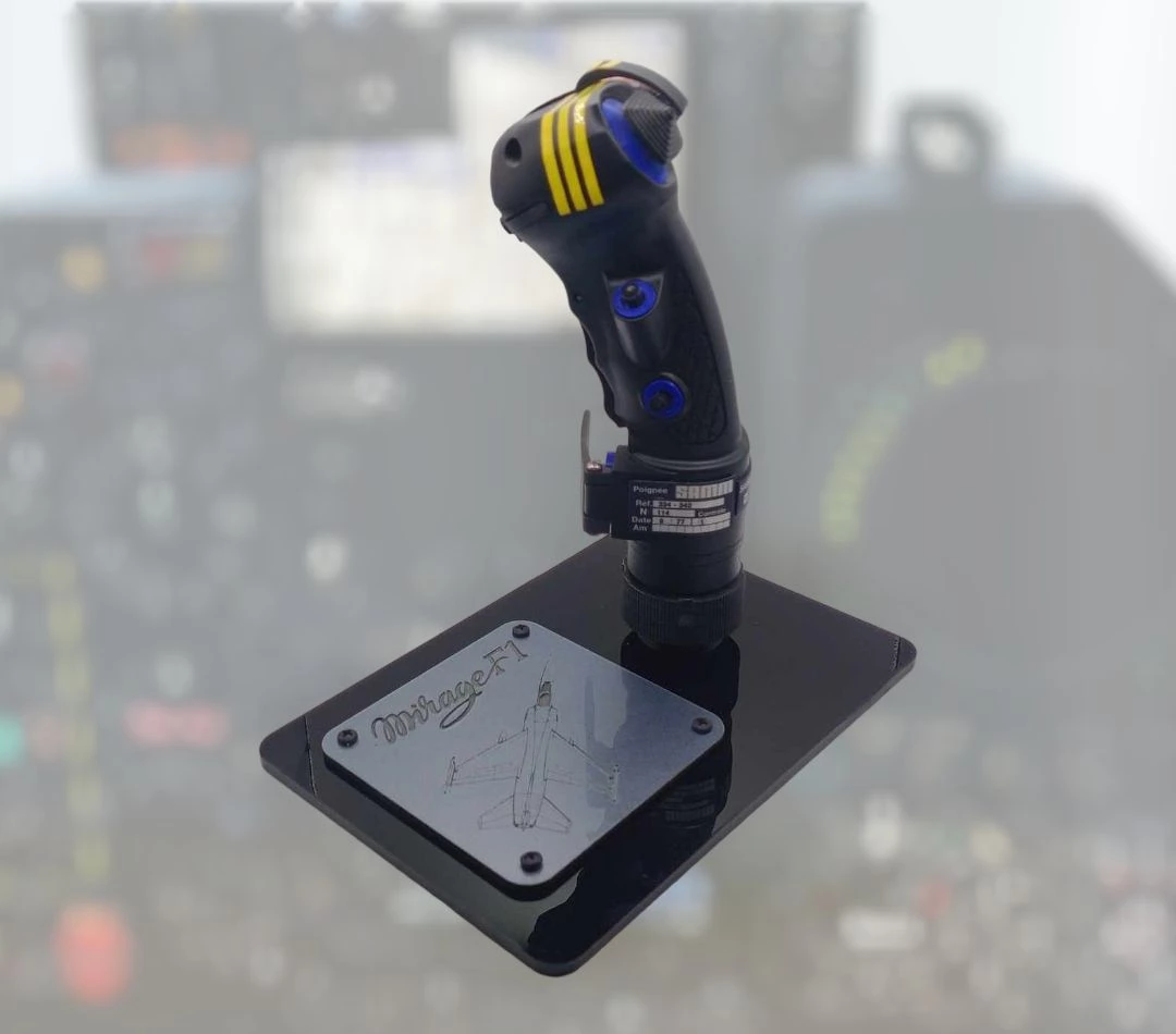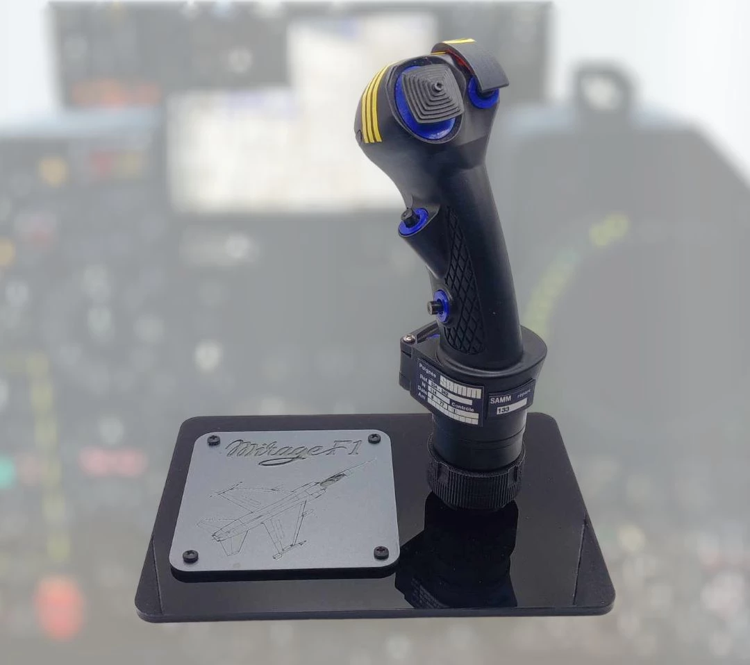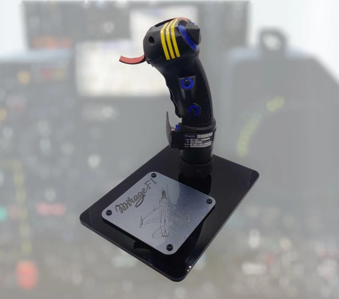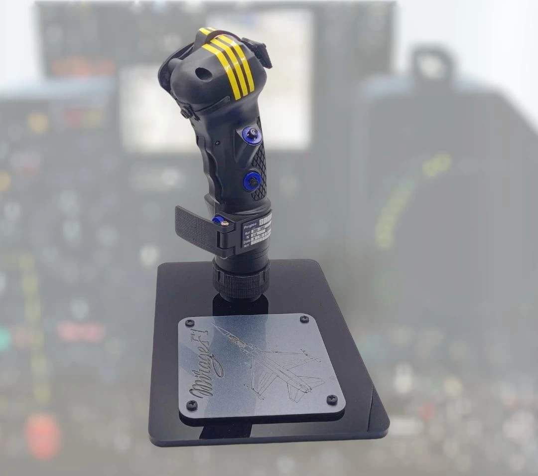 A 1/1 scale replica of the MIRAGE F-1 control stick , featuring active switches, active HATs and trim for unsurpassed realism crafted with unparalleled quality and fidelity to grace your collection.